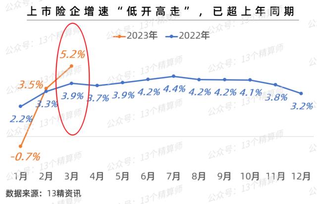 从过去4年的数据看,2023年一季度末上市险企的保费增速,已经超过2022年同期的3.9%,以及2021年同期的2.5%,甚至是2020年同期的3.04%。