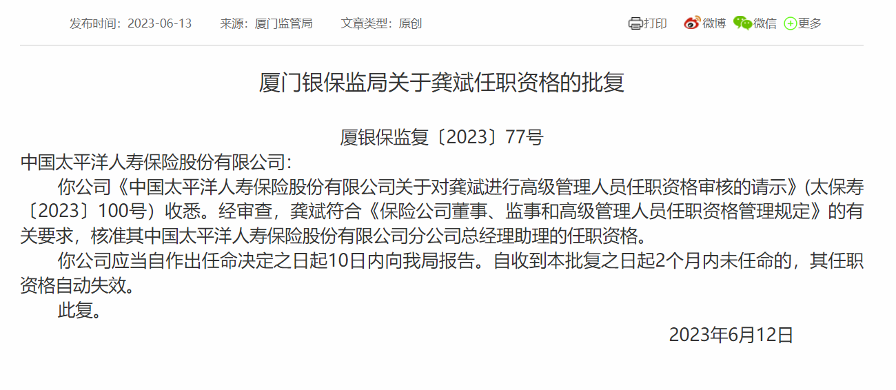 消息,6月13日,厦门银保监局发布《关于龚斌任职资格的批复》,核准中国太平洋人寿保险股份有限公司分公司总经理助理龚斌的任职资格,并要求公司自作出任命决定之日起10日内向厦门银保监局报告。