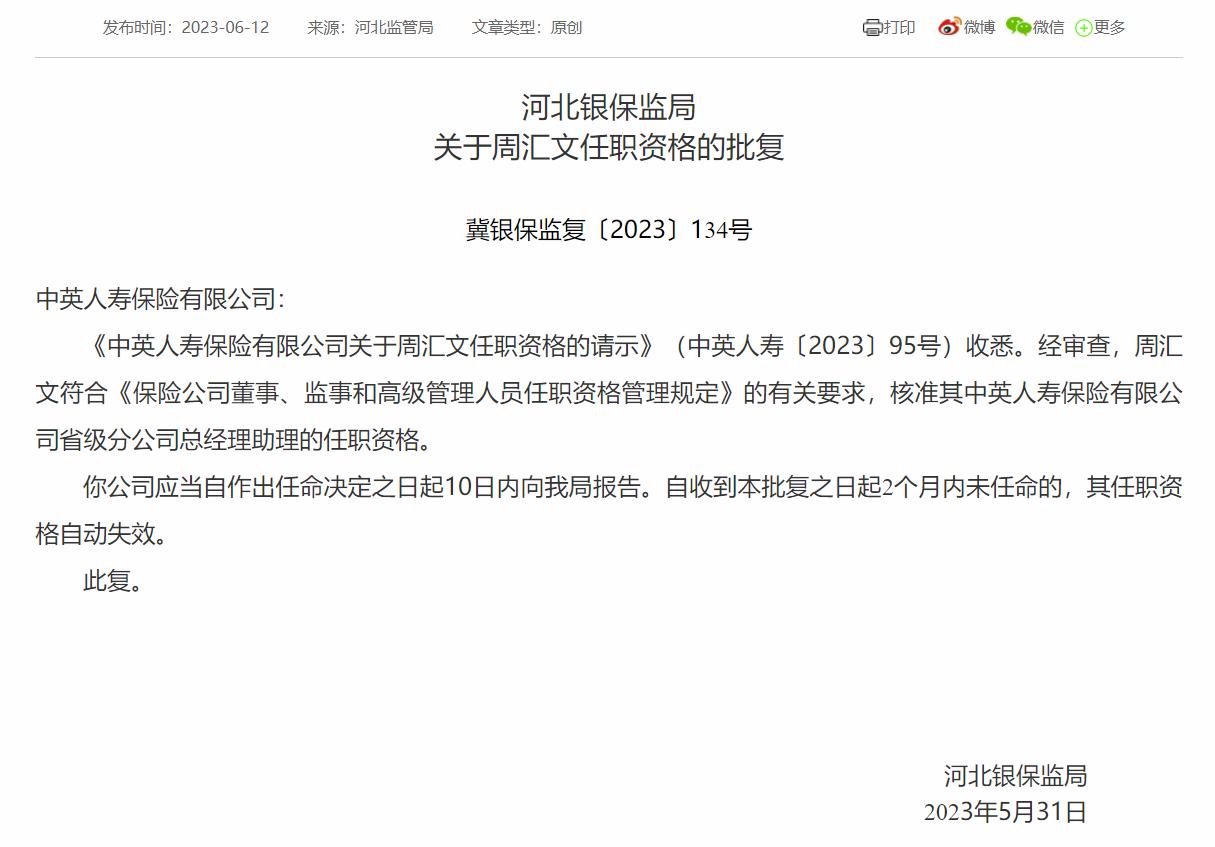 消息,6月12日,河北银保监局发布《关于周汇文任职资格的批复》,核准中英人寿河北分公司总经理助理周汇文的任职资格,并要求公司自作出任命决定之日起10日内向河北银保监局报告。