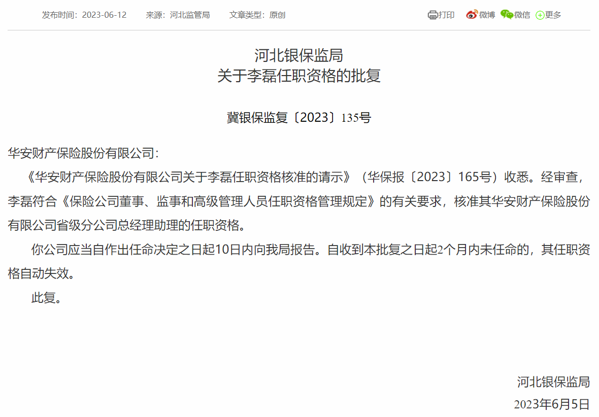 消息,6月12日,河北银保监局发布《关于李磊任职资格的批复》,核准华安财险河北分公司总经理助理李磊的任职资格,并要求公司自作出任命决定之日起10日内向河北银保监局报告。