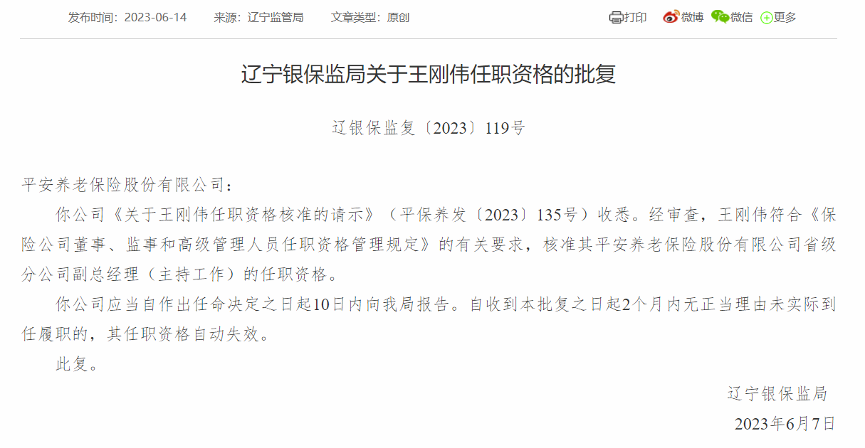 消息,6月14日,辽宁银保监局发布《关于王刚伟任职资格的批复》,核准平安养老辽宁分公司副总经理(主持工作)王刚伟任职资格,并要求公司自作出任命决定之日起10日内向辽宁银保监局报告。