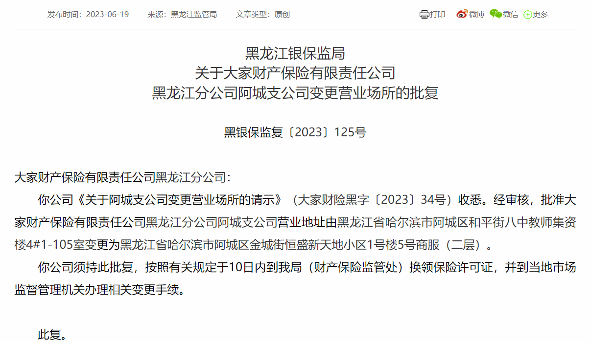 大家财险黑龙江分公司阿城支公司营业场所变更获批