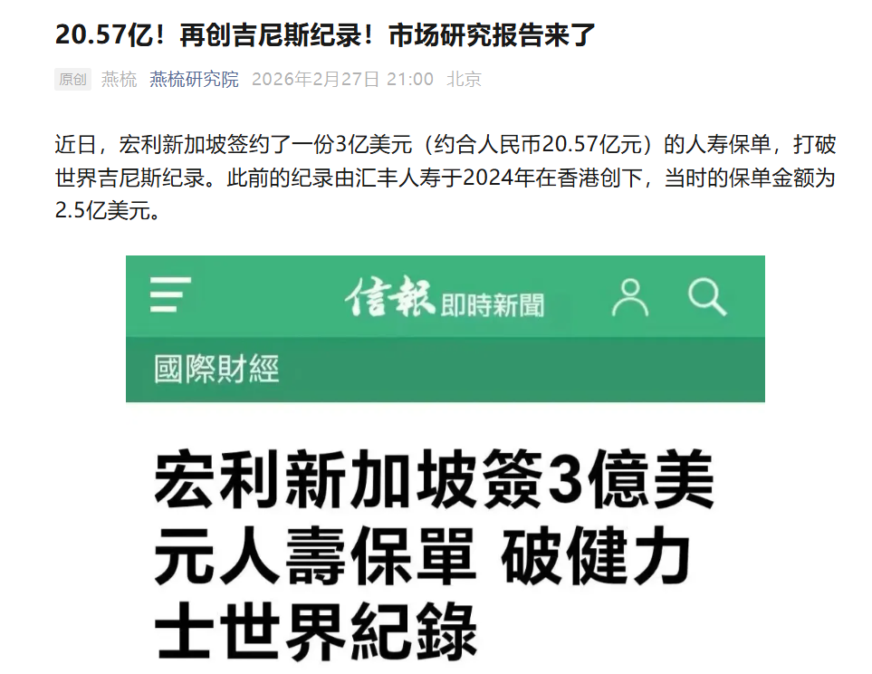 最近,宏利新加坡签下一份3亿美元(约合人民币20.57亿元)的人寿保单,刷新了吉尼斯世界纪录。此前的纪录保持者是汇丰人寿,2024年在香港创下的2.5亿美元。