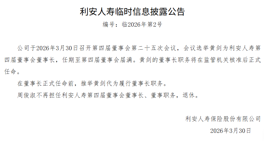 近日,利安人寿发布公告称,公司于2026年3月30日召开第四届董事会第二十五次会议,会议选举黄剑为利安人寿第四届董事会董事长,任期至第四届董事会届满。黄剑的董事长职务将在监管机关核准后正式任命。在董事长正式任命前,推举黄剑代为履行董事长职务。同时,周俊淑不再担任利安人寿第四届董事会董事长、董事职务,退休。