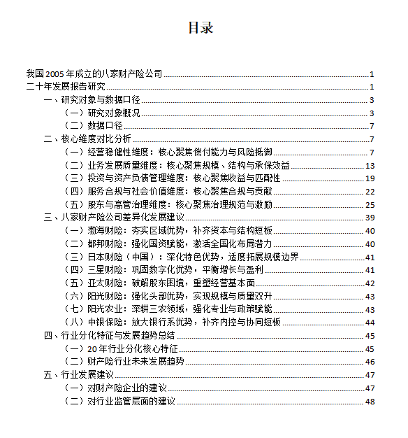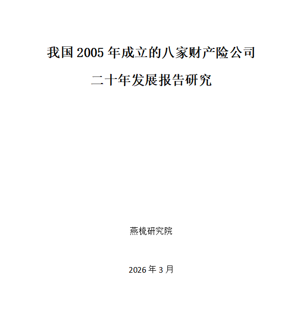 本报告以2005年成立的渤海财险、都邦财险、日本财险(中国)、三星财险、亚太财险、阳光财险、阳光农业、中银保险八家财产险公司为研究对象,依托财产险行业课题研究指标体系,以同一时期成立的保险公司为基点,从经营稳健性、业务发展质量、投资与资产负债管理、服务合规与社会价值、股东与高管治理五大核心维度进行分析,通过20年发展历程,展现分化特征、发展趋势,为行业高质量发展提供实践参考,也为企业发展提供镜鉴与思路。本报告由专业保险研究机构金融界燕梳研究院编制。