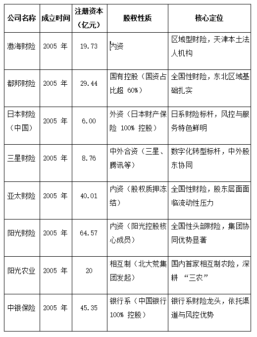 本次研究选取的八家财产险公司均成立于2005年,注册资本、股权性质与核心定位呈现显著差异化特征,形成了层次分明、赛道多元的发展格局,具体概况如下表所示: