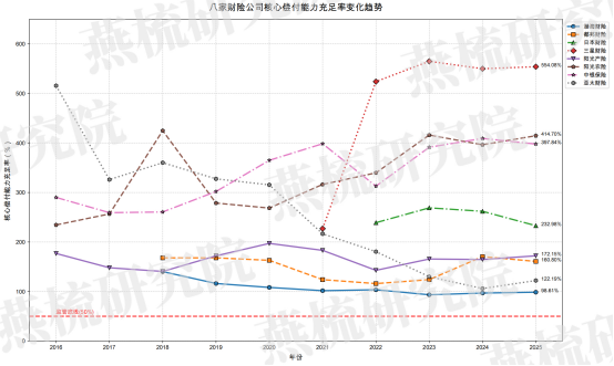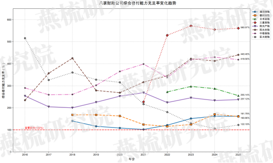 该指标衡量资本总体充足状况,八家公司均高于 100% 监管底线,数值走势与核心偿付能力充足率基本一致,2016-2025 年十年趋势呈现头部企业持续高位、部分企业稳中有升、个别企业贴近底线的特征。三星财险(560.97%)、中银保险(418.5%)、阳光农业(440.4%)为极度充足梯队,十年间始终处于高位,资本总体实力雄厚;日本财险(中国)(255.14%)、阳光财险(237.12%)为稳健充足梯队,综合资本充足率支撑规模化与特色化经营;都邦财险(160.8%)、渤海财险(161.79%)、亚太财险(122.19%)为基础达标梯队,亚太财险十年间贴近监管底线,资本缓冲空间极小,渤海财险虽评级改善但资本缓冲仍不足。