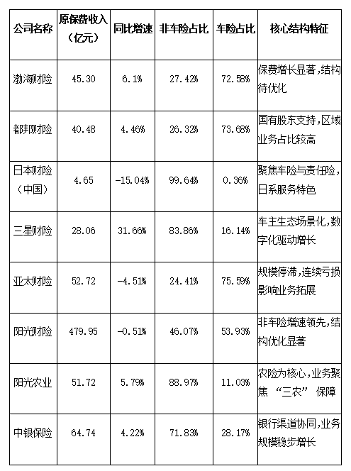 八家公司在原保费收入、同比增速、车险与非车险结构上呈现规模两极分化、增速涨跌迥异、结构泾渭分明的特征,业务表现与股权背景、市场定位、经营策略高度绑定,具体指标如下表所示: