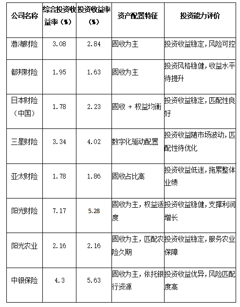 投资能力是财产险公司盈利补充与可持续发展的重要支撑,资产负债管理则决定资本运用效率与风险匹配度。本维度通过综合投资收益率、投资收益率结合资产配置特征,分析八家公司投资能力、收益稳定性与风险匹配度,具体指标如下表所示: