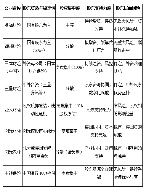 渤海财险、亚太财险、阳光财险均为内资企业,其中阳光财险依托阳光保险集团资源形成协同优势;亚太财险因股权质押冻结面临发展制约;渤海财险凭借纯内资背景扎根本土形成区域优势。
