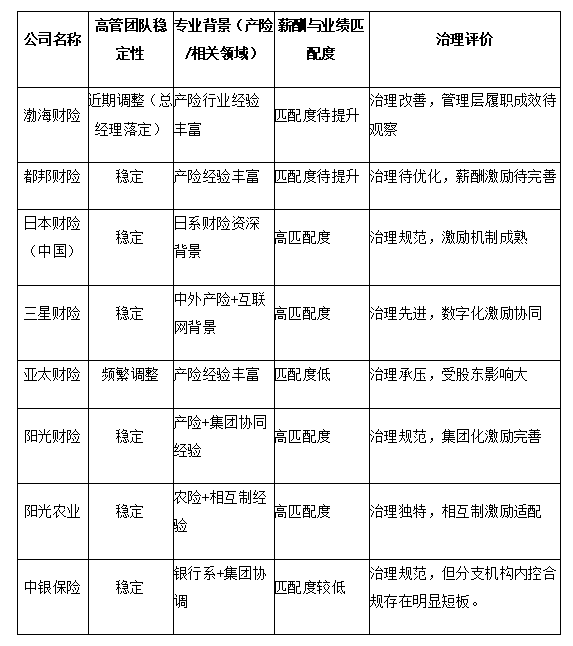股东治理规范、资源赋能充足的企业(中银保险、阳光财险、日本财险(中国)),高管团队稳定、激励机制有效,经营发展稳健且具备增长潜力;股东存在风险、治理失效的企业(亚太财险),高管团队频繁调整、激励失效,成为发展最滞后的企业;处于转型期的企业(渤海财险、都邦财险),治理存在阶段性问题,需通过优化治理实现发展突破。