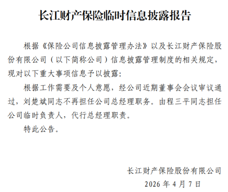 4月7日,长江财产保险股份有限公司(下称“长江财险”)发布公告称,根据工作需要及个人意愿,经公司近期董事会会议审议通过,刘楚斌不再担任公司总经理职务。由程三平担任公司临时负责人,代行总经理职责。