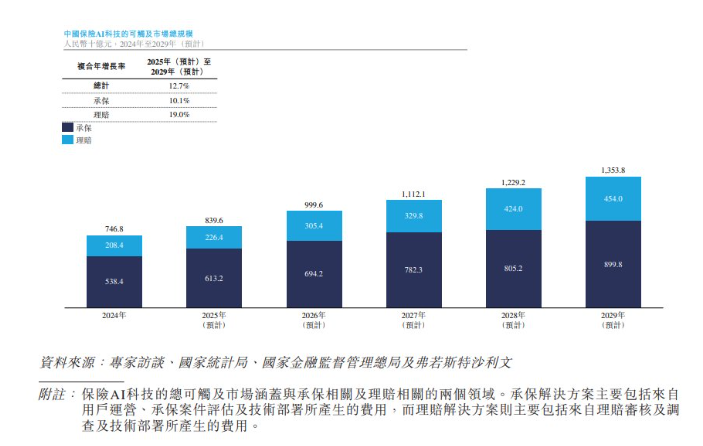于2024年,中国保险AI科技的总可触及市场规模(涵盖于承保解决方案与理赔解决方案应用AI科技产生的收入机会)达人民币7,468亿元,预计于2029年将达人民币 13,538亿元,2025年至2029年复合年增长率为12.7%。