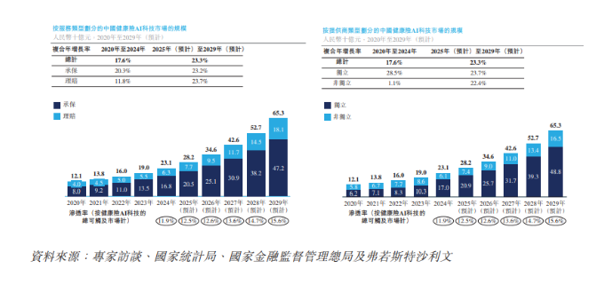 中国健保险AI科技行业市场规模由2020年的人民币121亿元增至2024年的人民币 231亿元,并于2029年进一步增长至人民币653亿元,2025年至2029年的复合年增长率为23.3%。尽管市场规模快速扩大,2024年中国健康险AI技术总可触及市场渗透率仍处于相对较低的11.9%,预计于2029年升至15.6%,显示市场蕴藏巨大发展机遇。