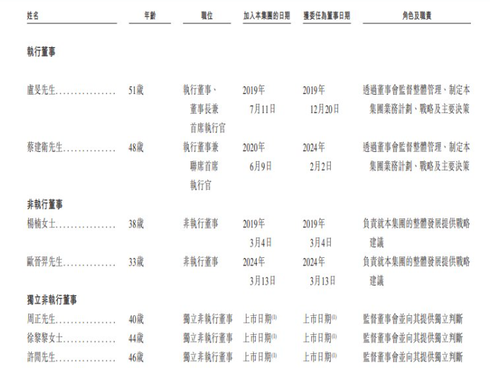上市后,董事会将由七名董事组成,包括两名执行董事、两名非执行董事及三名独立非执行董事。下表提供董事的若干资料: