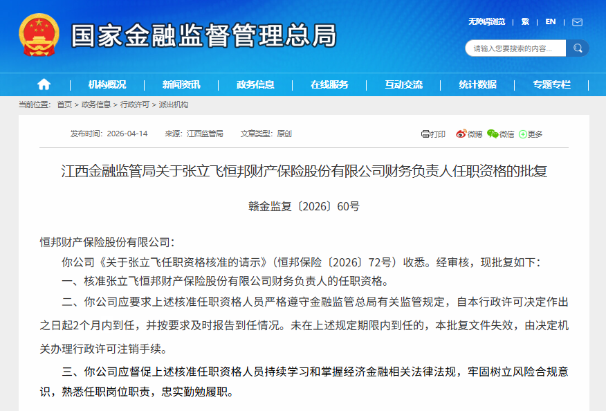 4月14日,据江西金融监管局网站,张立飞获批出任恒邦财险财务负责人。