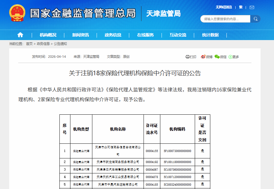 4月14日,据天津金融监管局网站,根据《中华人民共和国行政许可法》《保险代理人监管规定》等法律法规,天津金融监管局注销辖内16家保险兼业代理机构、2家保险专业代理机构保险中介许可证。