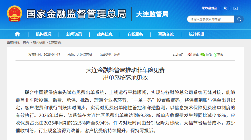 4月17日,据大连金融监管局网站,大连金融监管局发文称推动非车险见费出单系统落地见效。联合中国银保信率先试点见费出单系统,上线运行平稳顺畅,实现与各财险总公司系统无缝对接,能够覆盖非车险投保、缴费、承保、批改、理赔全业务环节,“一单一码”设置缴费码,将保费到账与保单出具绑定,客户缴费和银行到账实时同步,实现对见费出单刚性管控和穿透监测,以信息技术保障见费出单制度的有效执行。2026年以来,该系统在大连地区见费出单率达到99.3%,新单应收保费发生额同比减少48%,应收保费占比由2025年同期的12.5%降至6.94%,件均对账时间由分钟级降为秒级,大幅节省运营成本,减少催收纠纷,行业现金流得到改善,客户接受度持续提升,保持零投诉。